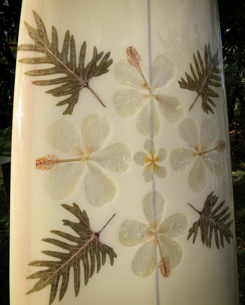 I build a handful of inlayed boards and resin pieces every year, the flowers are collected from our neighborhood and pressed at home before being inlayed under fiberglass or into blocks of clear resin or glass. They are inspired by Hawaiian quilts and my wife, Katie, who teaches me to look beyond the immediate. The process is tedious and I always find the results captivating & worthwhile. I tend not to take excessive orders for these and build them during the winters and spring time in Hawai’i - if you would like one, feel free to contact me and I can fill you in on any that are in the works or if I can work one up custom for you.